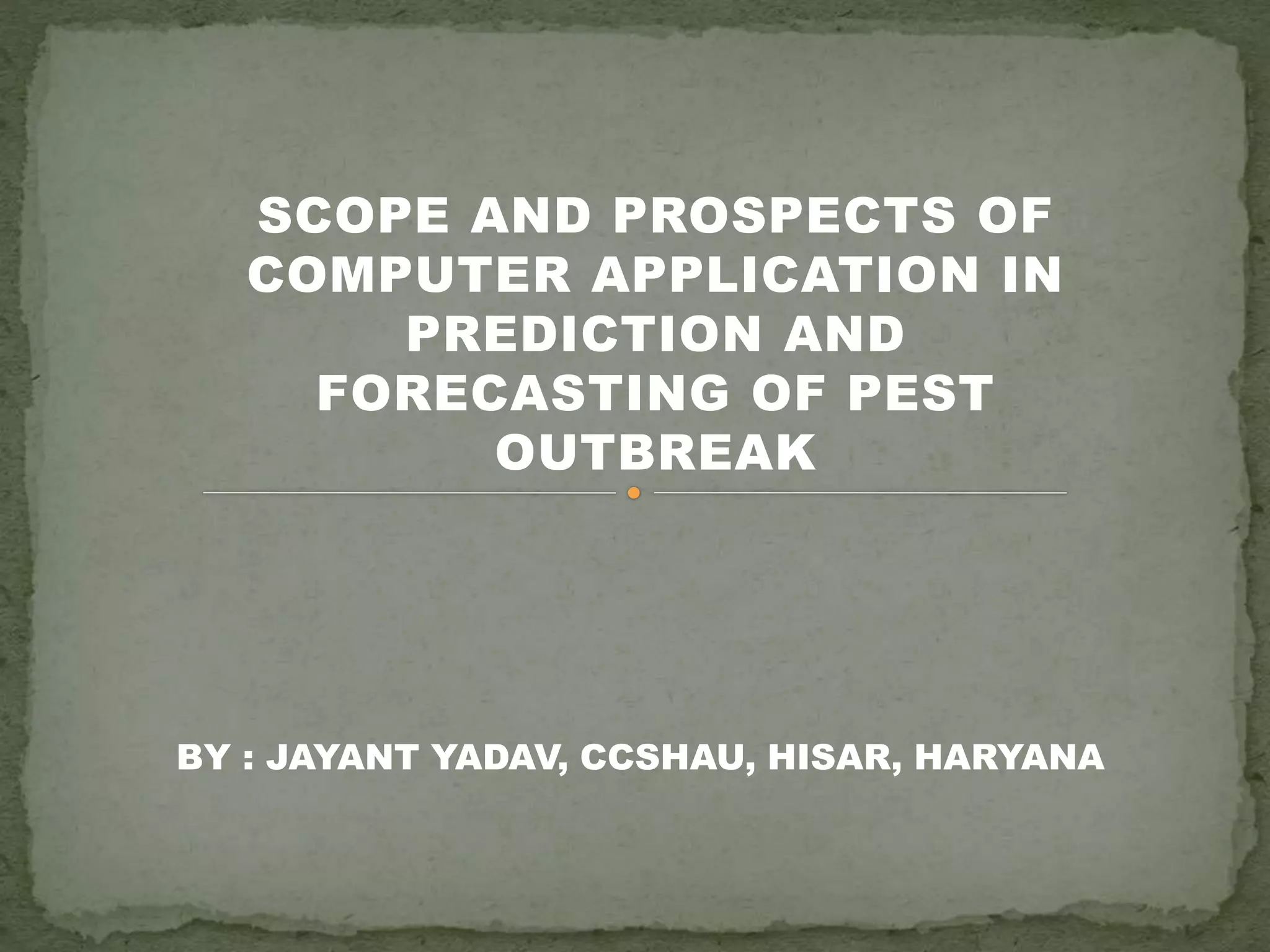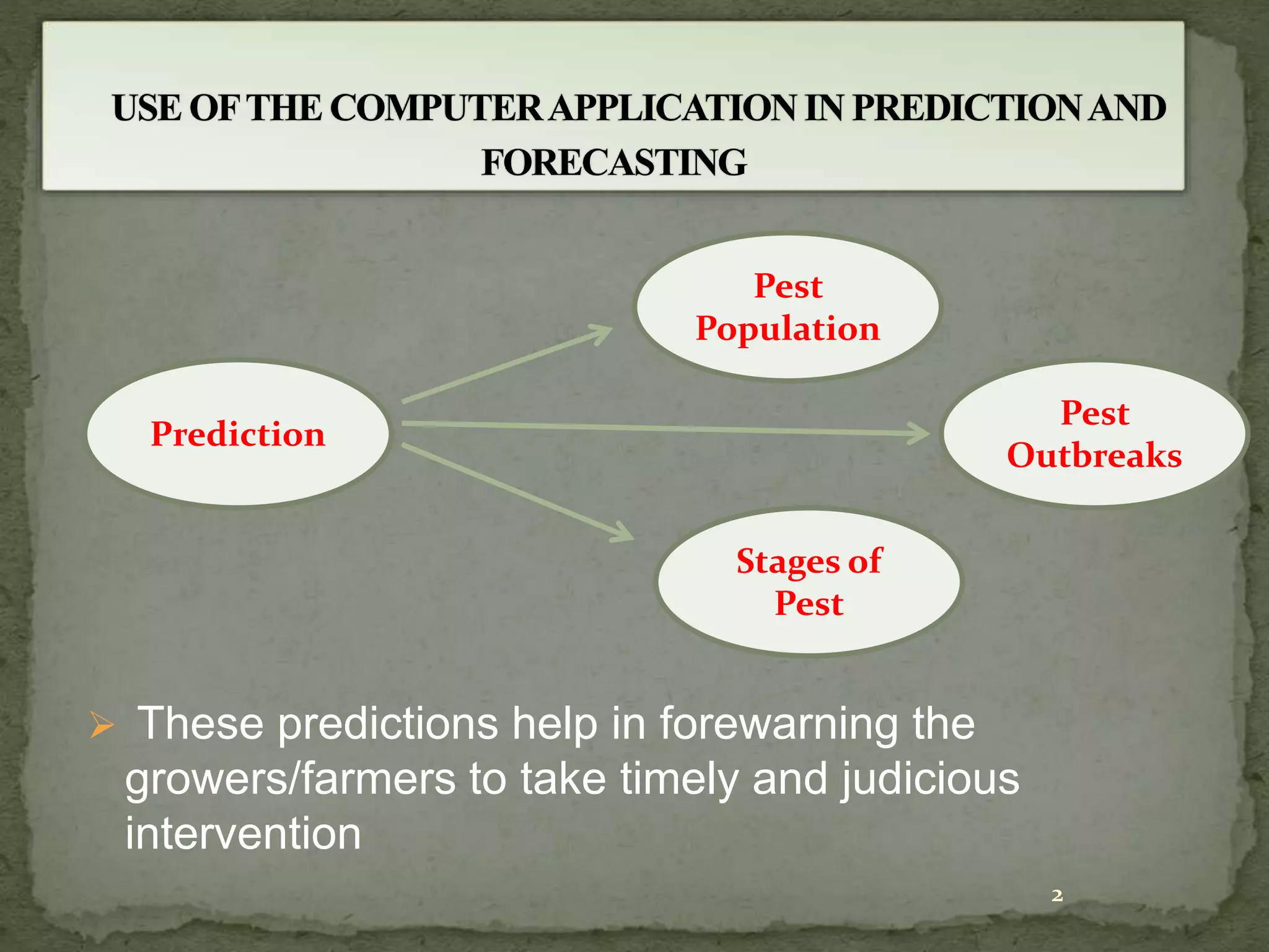 This document discusses the use of computer applications for predicting and forecasting pest outbreaks. It describes how short-term and long-term pest forecasting can help farmers take timely action to control pests. Remote sensing, geographic information systems, databases, and decision support systems are computer tools that can monitor pest infestation levels, identify pest-damaged crops, store pest data, and provide recommendations to farmers. Expert systems have also been developed to help identify pests, estimate pest risk, and recommend control measures. Overall, computer applications are improving pest management by enabling early detection of pest issues and advising farmers on optimal control strategies.