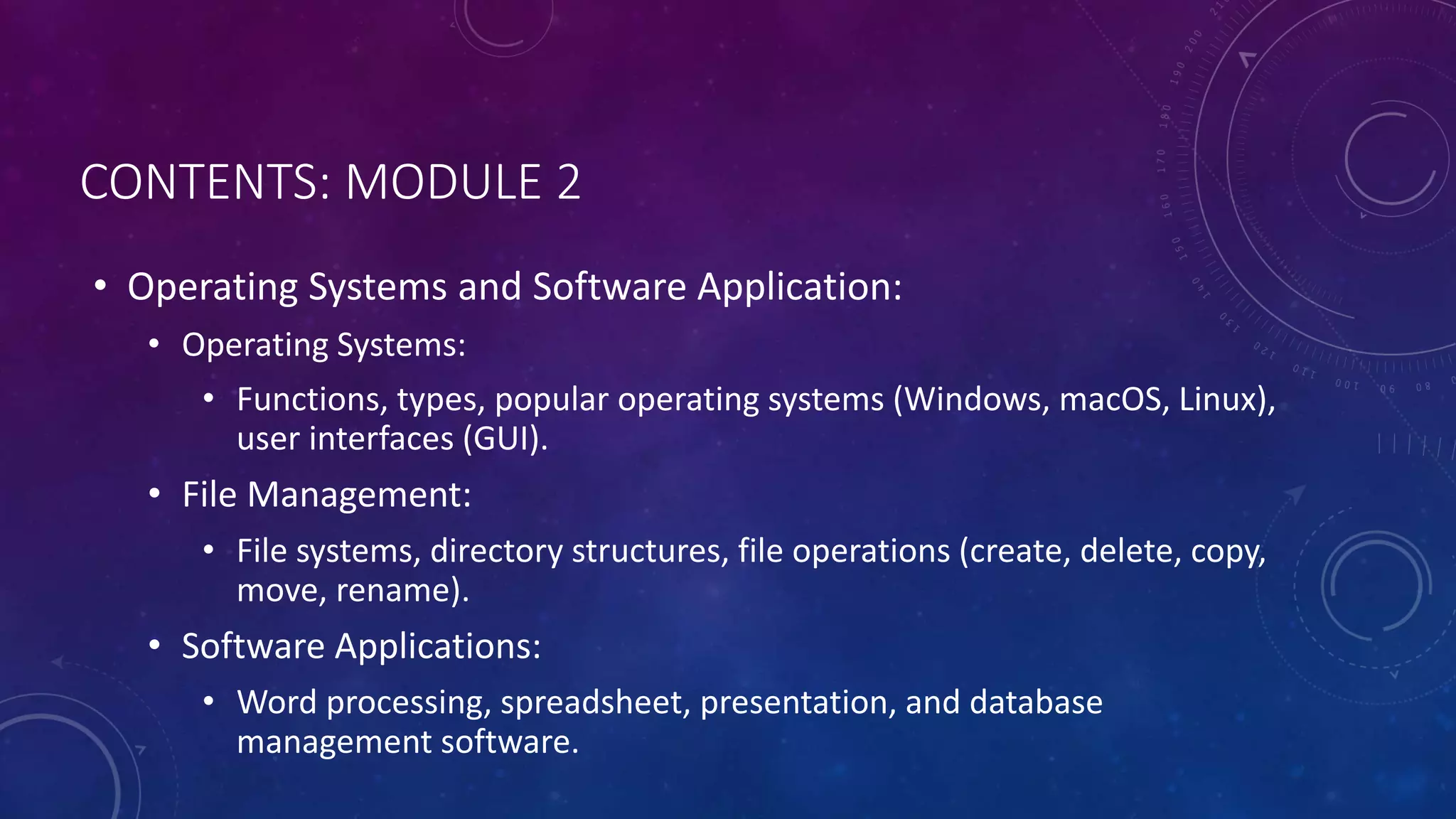 The document discusses operating systems and software applications. It provides an overview of operating systems, including their functions, types, popular systems like Windows, macOS and Linux, and user interfaces. It describes file management with file systems, directory structures and common file operations. Key software applications are also mentioned like word processing, spreadsheets, presentations and databases.