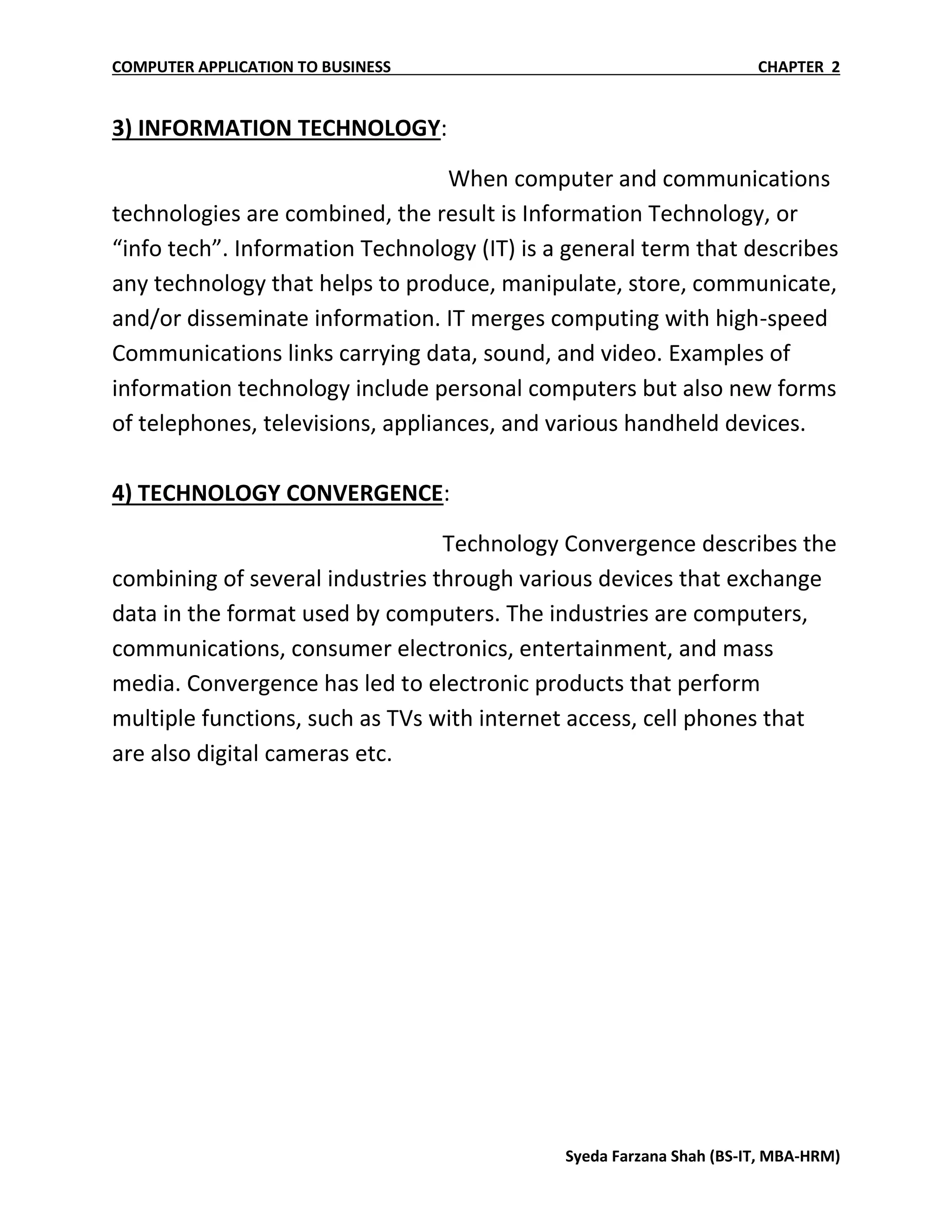 The document defines technology as the transformation of scientific knowledge into devices or machines. It details various types of technology, including computer technology, communication technology, and information technology, along with their purposes and functions. Additionally, it discusses technology convergence, which refers to the merging of multiple industries to enable devices to perform various functions.