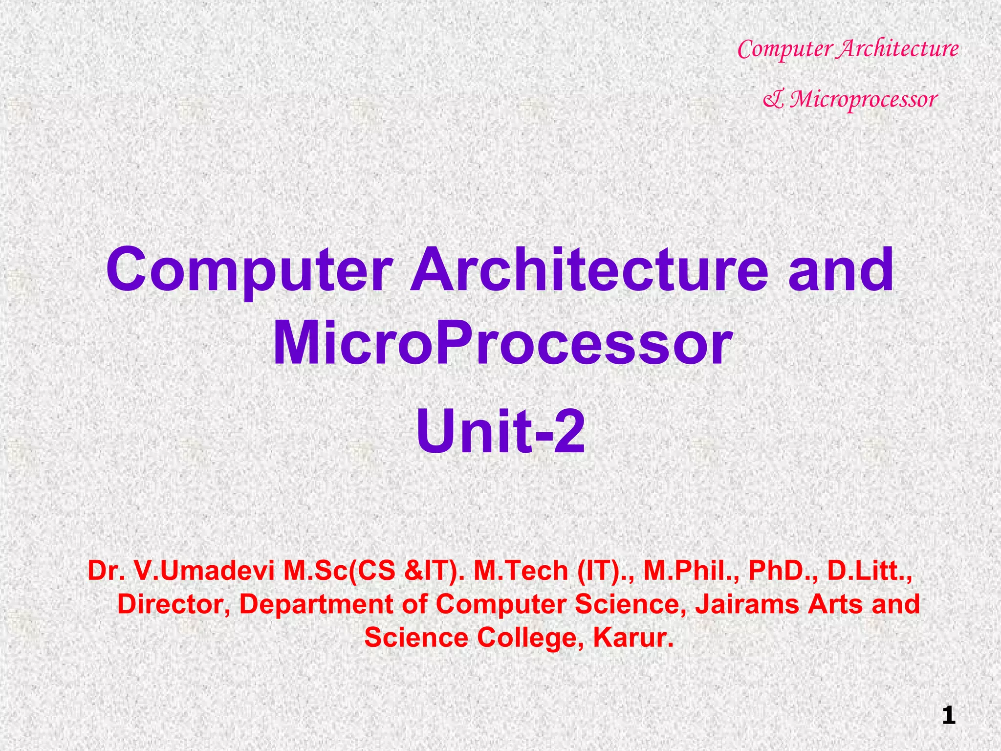 The document provides an overview of computer architecture and microprocessors. It discusses microprocessor components like the accumulator, registers, flags, and control bus. It describes microprocessor operations like memory reads, writes and I/O. It also covers the 8085 microprocessor architecture in detail, including its pin configuration, buses, registers, interrupts and timing.