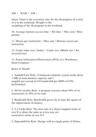 The document outlines key computer architecture formulas and principles, including performance metrics such as CPU time, Amdahl's Law, and memory access times. It discusses the importance of domain-specific architectures in leveraging the slowdown of Moore's Law and the evolving landscape of computer architecture. Additionally, it highlights updates in the sixth edition of 'Computer Architecture: A Quantitative Approach,' emphasizing newly incorporated technology advancements and real-world applications.