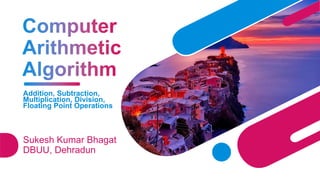 Computer arithmetic involves methods and techniques for performing arithmetic operations like addition, subtraction, multiplication, and division, primarily using binary representations. Efficient algorithms are crucial for optimizing performance, resource usage, and accuracy in various applications, including scientific computing and real-time systems. Techniques such as carry lookahead addition, two's complement subtraction, and the Karatsuba algorithm enhance speed, reduce complexity, and support large-scale computations in digital systems.