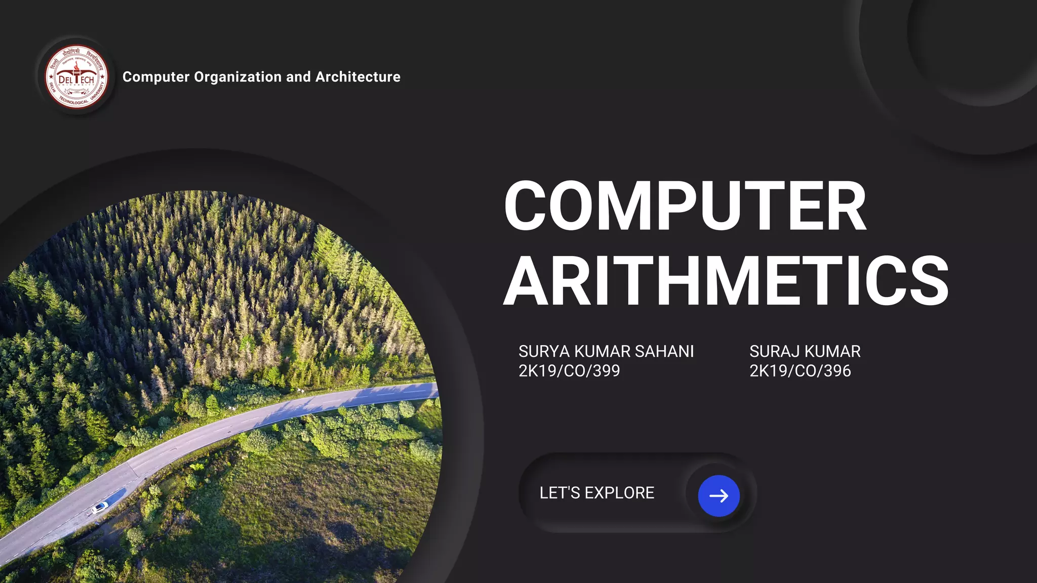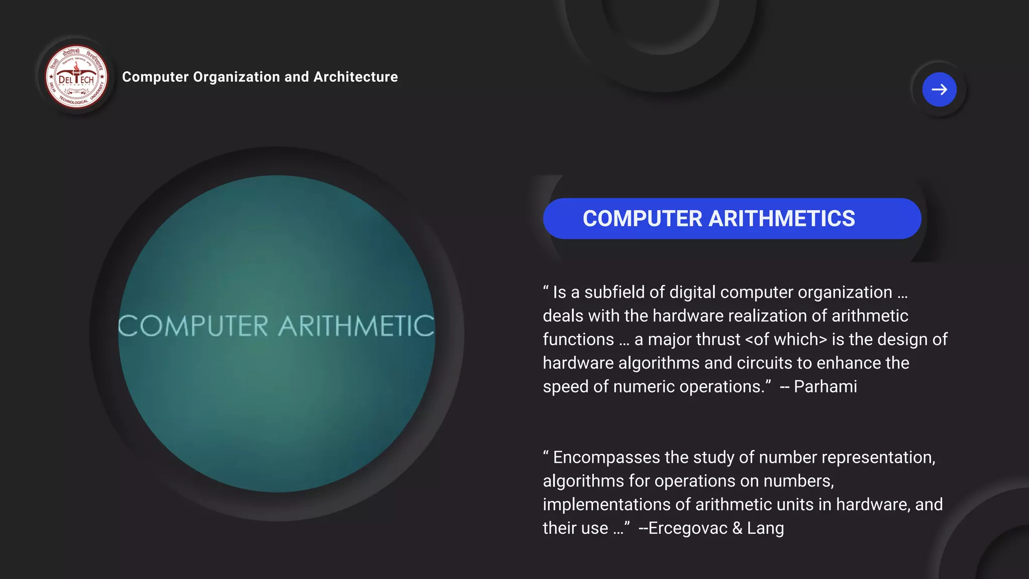 Computer arithmetic deals with efficient implementation of numeric operations like addition, subtraction, multiplication, and division in hardware. It includes representing numbers, designing circuits for operations, and balancing accuracy, speed, power usage, and other factors. Applications include general purpose processors, graphics cards, signal processing systems, and more. Common algorithms discussed are signed magnitude representation and operations, Booth multiplication, array multiplication, floating point representation and operations.
