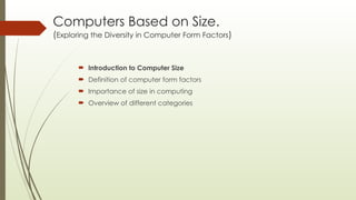 The document discusses various computer form factors categorized by size, including mainframe, desktop, server, laptop, tablet, wearable, and embedded computers. It highlights their descriptions, use cases, and provides examples for each type. The conclusion emphasizes the importance of selecting the appropriate form factor based on specific needs and mentions future trends in computer size and form factor development.