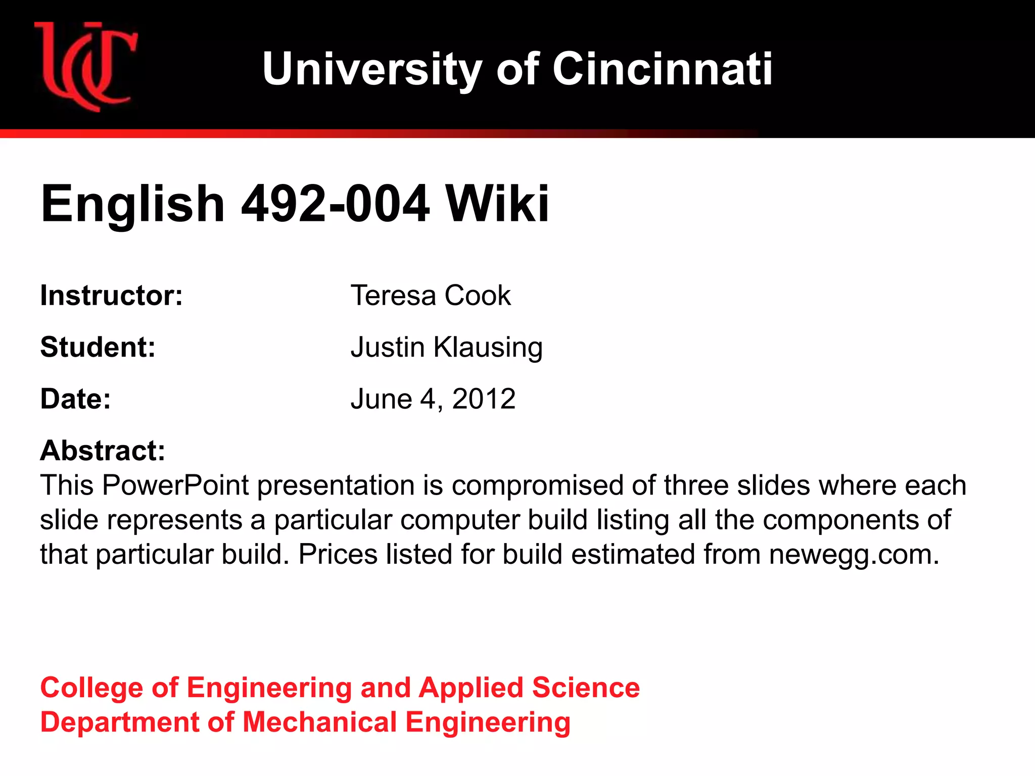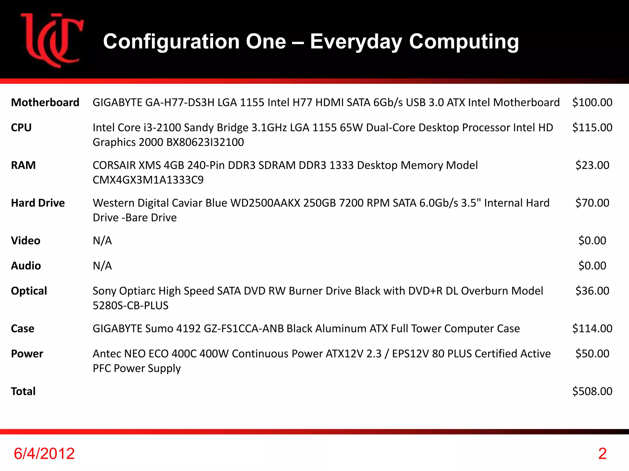 This PowerPoint presentation contains three computer build configurations with components and prices. Configuration One is for everyday computing and has an Intel Core i3 processor and costs $508. Configuration Two is for gaming and media with an Intel Core i5 processor and costs $1,314. Configuration Three is an engineering system with an Intel Core i7 processor and costs $2,006.
