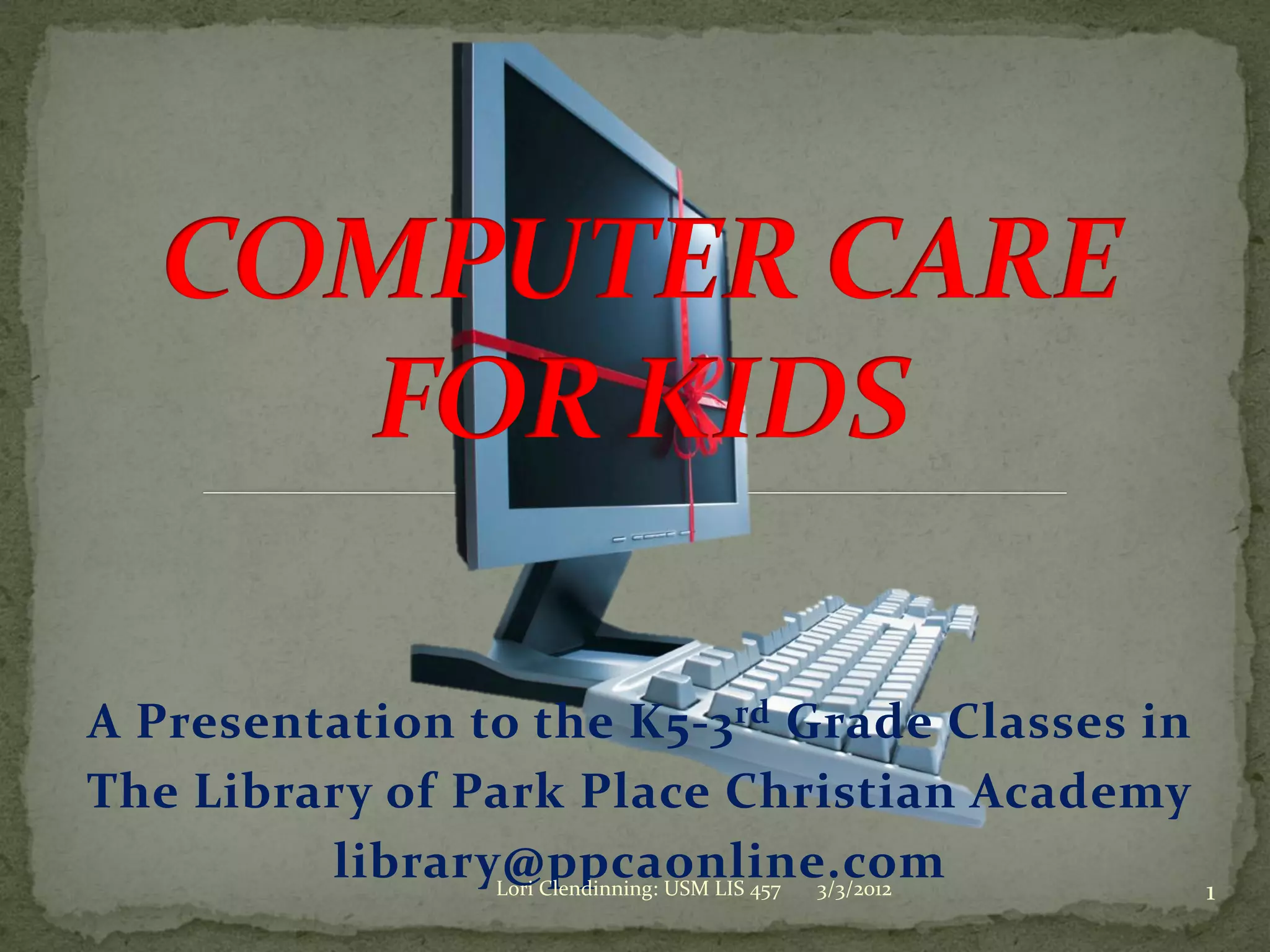 The document is a presentation aimed at K5-3rd grade students at Park Place Christian Academy regarding library and computer safety practices. Key points include keeping hands clean, not consuming food or drinks near computers, and maintaining privacy by not sharing personal information online. It emphasizes the importance of adult supervision when dusting computers and handling electrical parts.