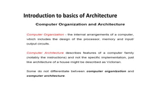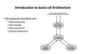 The document provides an overview of computer architecture, detailing functions such as data processing, storage, movement, and control. It explains the structure of a computer system, focusing on the CPU, bus systems, and common bus configurations for efficient information transfer. The document also highlights the use of multiplexers and three-state buffers in constructing bus systems to manage data flow among various components.