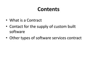 This document discusses different types of contracts used for software services projects. It covers fixed price contracts, contract hire agreements, time and materials contracts, and consultancy contracts. For fixed price contracts, it describes the typical structure including introductory section, terms and conditions, appendices. Key elements that must be specified in the contract are what is to be produced, deliverables, ownership of rights, payment terms, penalties, and obligations of both parties. The document also briefly touches on liability for defective software.