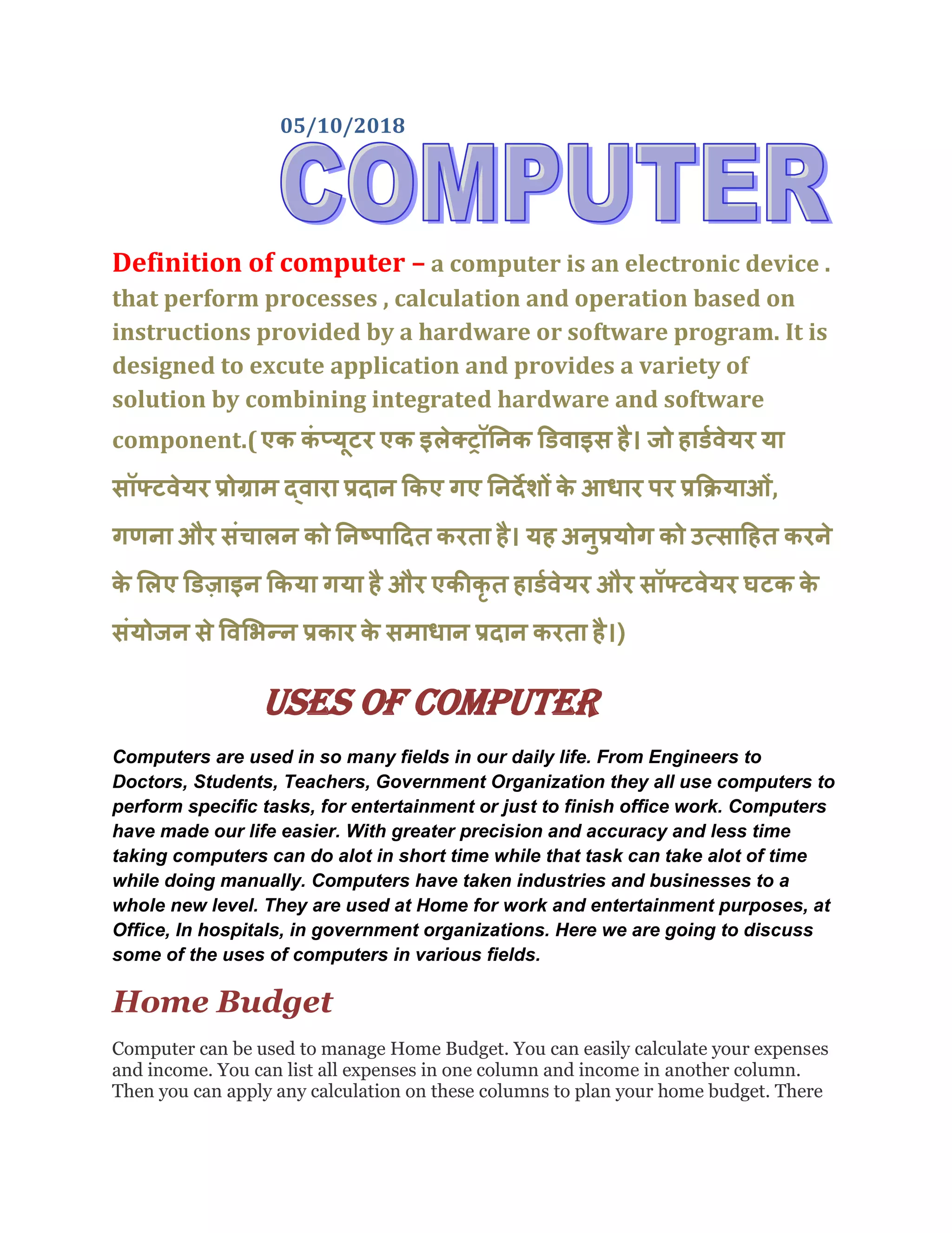 A computer is an electronic device that performs processes, calculations and operations based on instructions provided by hardware or software programs. It is designed to execute applications and provides solutions by combining integrated hardware and software components. Computers are used in many fields like engineering, education, business, medicine and more. They perform tasks with greater precision, accuracy and speed compared to manual methods.