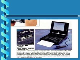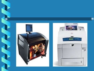 The document discusses various types of computer output devices, including display screens, printers, plotters, audio output, video output, virtual reality devices, and robots. It covers the different technologies used in common output devices like CRT and LCD screens, inkjet and laser printers, and provides examples of how output is used across different mediums like audio, video, and virtual reality simulations.