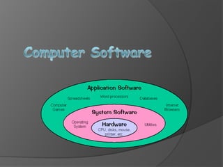 The document describes the distinctions between software and hardware, with software being defined as intangible programs that enable computers to perform specific tasks, while hardware refers to tangible components. It covers key concepts such as software licensing, upgrades, and types of software including system software, application software, open source, and proprietary software. Examples of application software are highlighted, demonstrating its role in business functions like payroll, inventory management, and document creation.