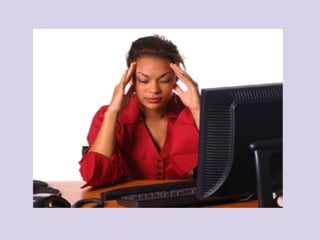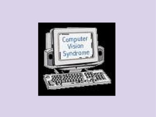 Computer ergonomics aims to optimize human well-being and performance by matching workplace tasks to workers using appropriate equipment. An ergonomic checklist includes adjustable chairs, properly positioned monitors at eye level, footrests for those whose feet don't touch the floor, and limiting glare and noise. Carpal tunnel syndrome is inflammation of the median nerve from repetitive stress that causes numbness, and can be prevented through ergonomic practices. Slouching at computers can lead to back pain and poor posture over time. Extended computer use can cause eye strain, headaches, and blurred vision from factors like glare, but no permanent damage. Special keyboards, mice, chairs, and workstation setups can help address ergonomic issues.