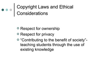 The document discusses copyright laws and fair use guidelines for educators. It provides an overview of copyright laws and their intent to protect intellectual property. Fair use allows for limited use of copyrighted works for educational purposes without permission. The document includes a quiz testing knowledge of what is permissible under fair use. It concludes with recommendations for how educators can stay informed of fair use guidelines and properly attribute sources to avoid plagiarism.
