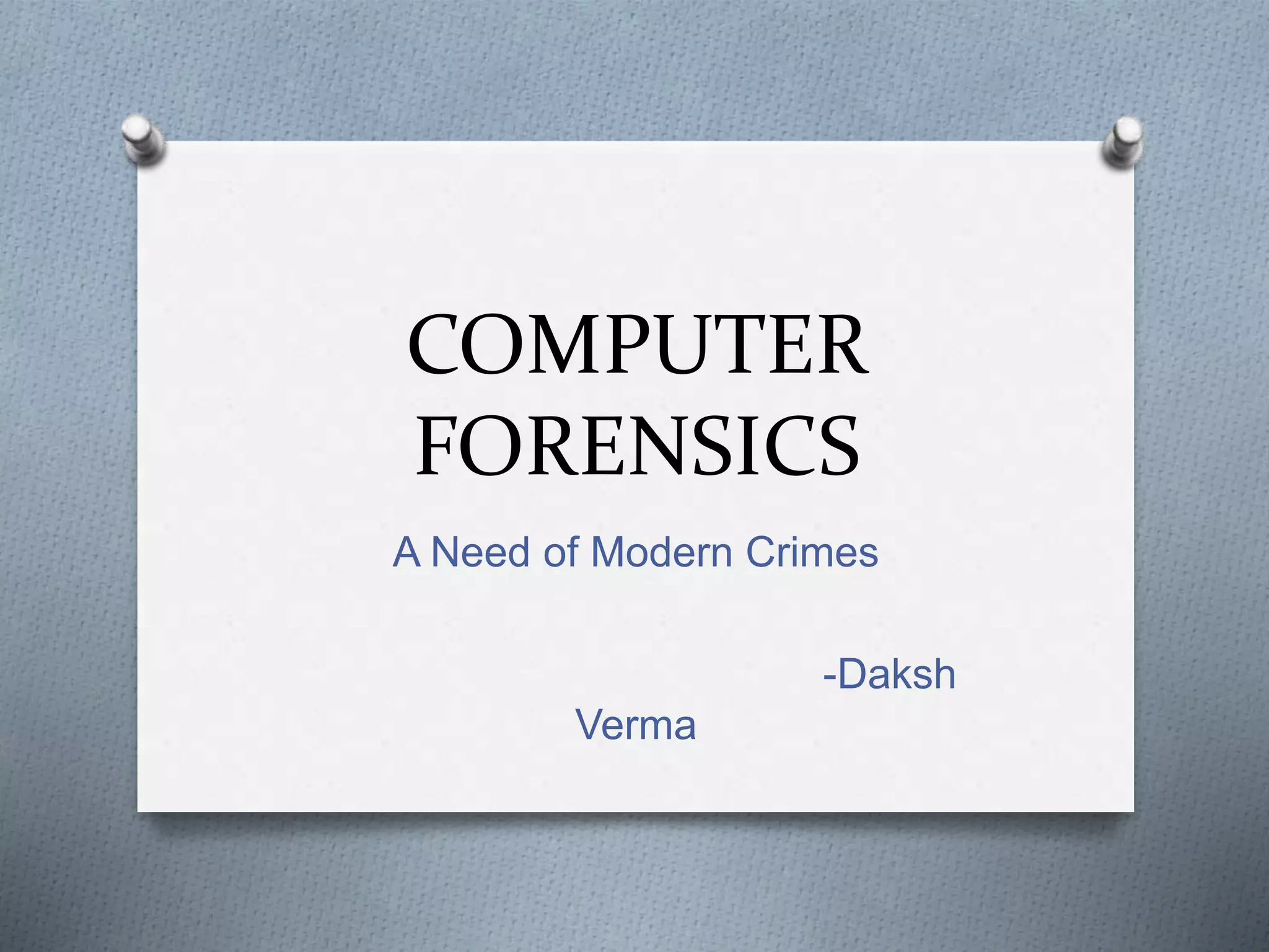 Computer forensics involves identifying, preserving, analyzing, and presenting digital evidence for legal matters, focusing on persistent and volatile data. It plays a critical role in addressing cyber crimes such as hacking, identity theft, and industrial espionage, ensuring the integrity of systems while aiding in criminal prosecution. The process encompasses acquisition, identification, evaluation, and presentation of evidence, utilizing various tools to enhance the accuracy of evidence retrieval.