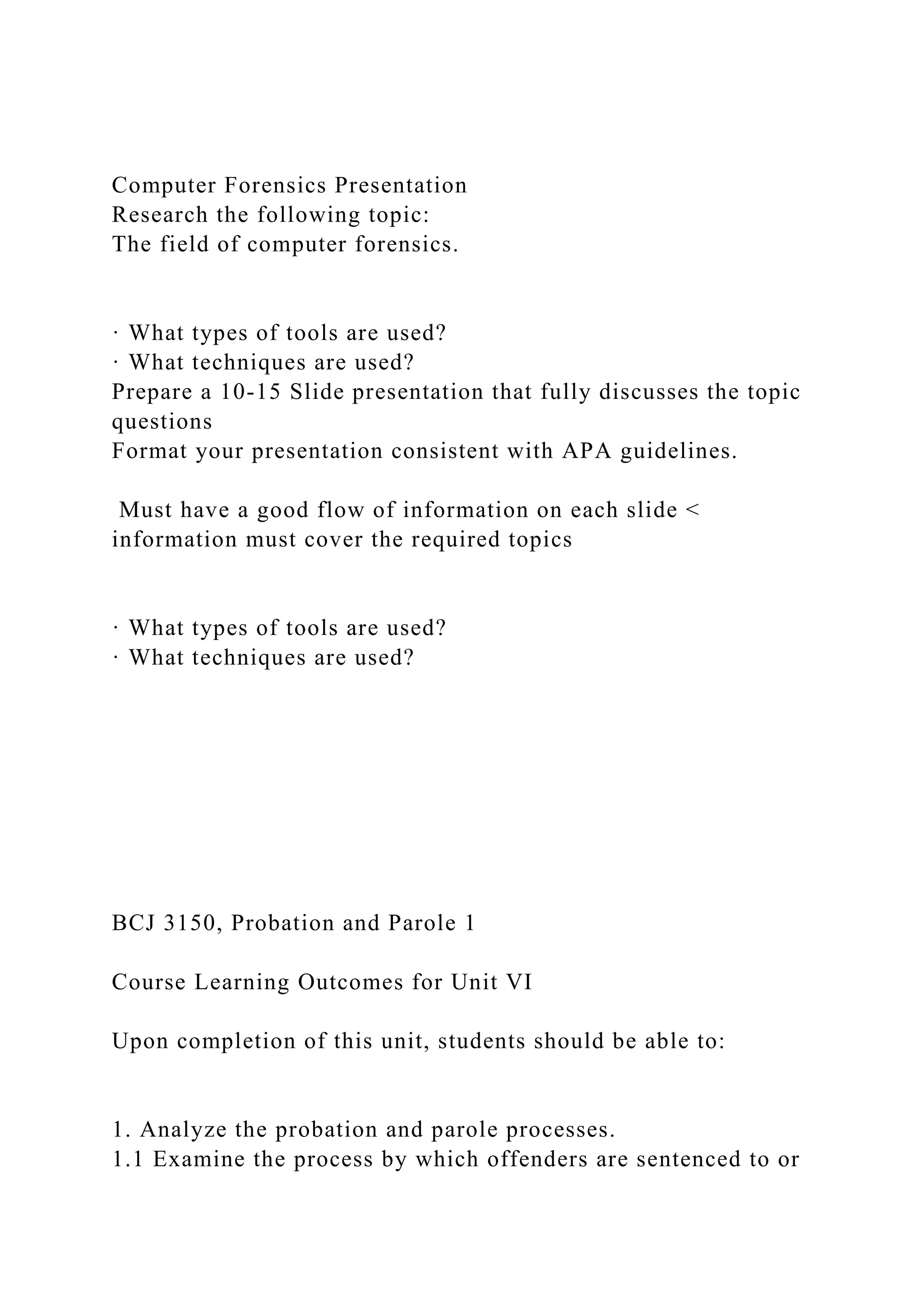 The document discusses the field of computer forensics, focusing on the tools and techniques used for analyzing digital evidence. It also covers the challenges faced by probation and parole systems in balancing technological monitoring with effective rehabilitation strategies, emphasizing the need for evidence-based practices to reduce recidivism. Moreover, it critiques the current system's reliance on technology, which may fail to address underlying issues leading to criminal behavior.