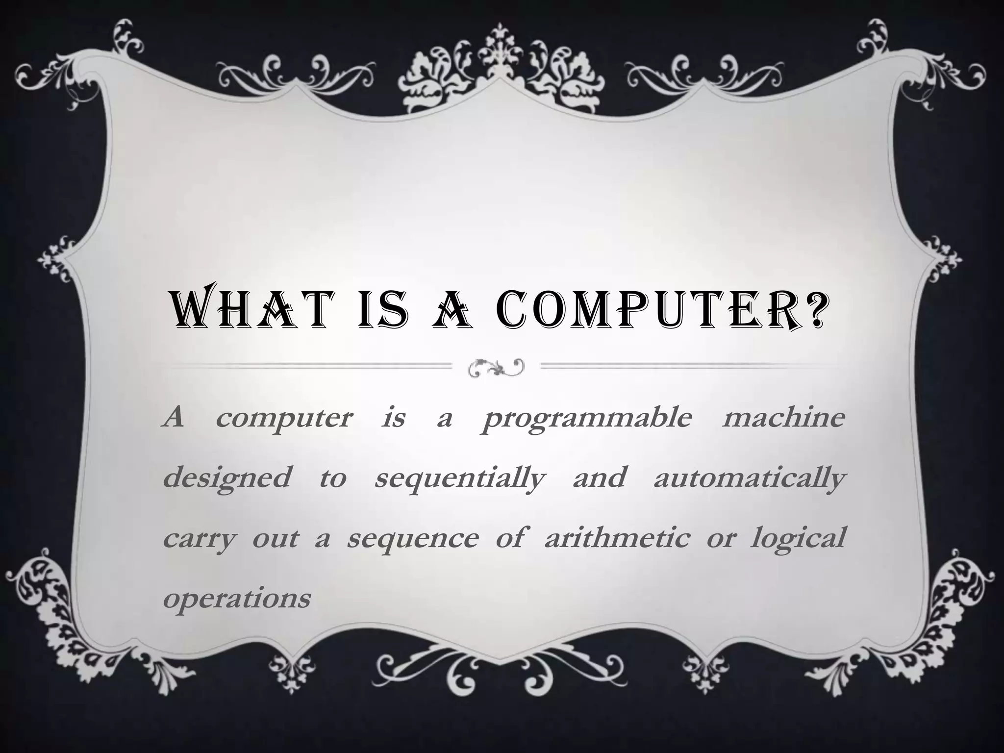 This document provides an overview of computers and their basic components. It defines a computer as a programmable machine designed to carry out arithmetic and logical operations. It then describes the basic computer operations of input, storage, processing, and output. Input involves entering data and programs into the system. Storage saves data and instructions permanently. Processing performs arithmetic and logical operations on the stored data. Output produces results from the data for useful information. The document concludes by describing the main hardware components of a computer including the motherboard, power supply, removable media, secondary storage, and input/output peripherals.