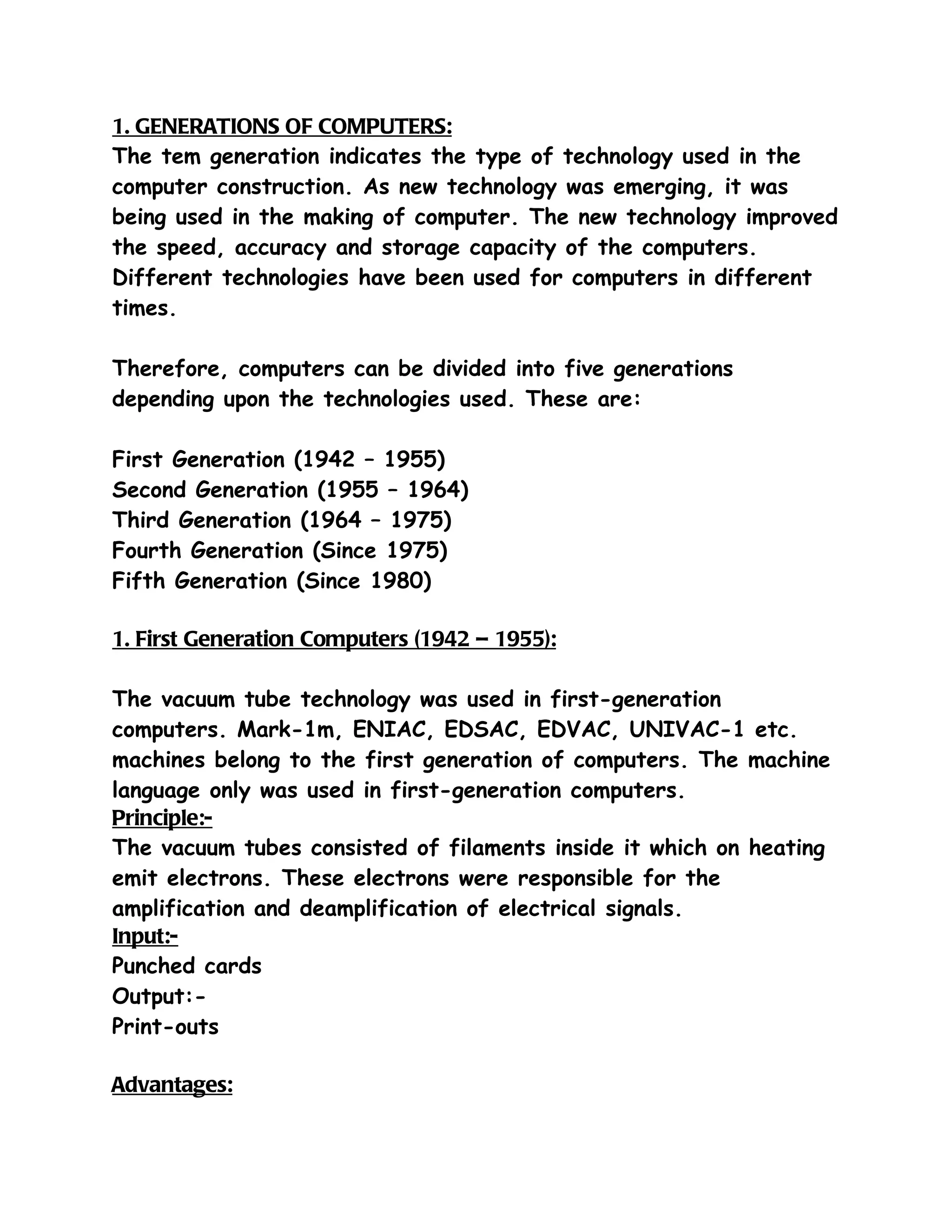 The document discusses the five generations of computers based on the underlying technologies used. The first generation used vacuum tube technology, while the second generation introduced transistor technology. The third generation was based on integrated circuit (IC) technology, and the fourth generation used microchip technology. The fifth generation aims to develop computers with human-like thinking capabilities using technologies like ultra-large-scale integrated circuits and artificial intelligence. The document also covers other classification methods of computers like by purpose, size, and operating principles.