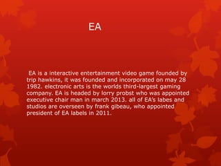 - Electronic Arts (EA) is one of the largest third-party video game publishers founded in 1982 by Trip Hawkins. EA is headed by Andrew Wilson and Frank Gibeau.
