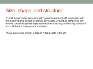 The computer games industry comprises around 485 businesses, most of which are game developers. It employs around 7,000 people in the UK. Some notable game developers and publishers include Rockstar Games, known for the Grand Theft Auto series, and Electronic Arts, the world's third largest gaming company. EA publishes popular franchises like Battlefield, The Sims, and owns major game studios. Computer games are linked to other industries like advertising, marketing, and music which help promote games and provide entertainment for players.