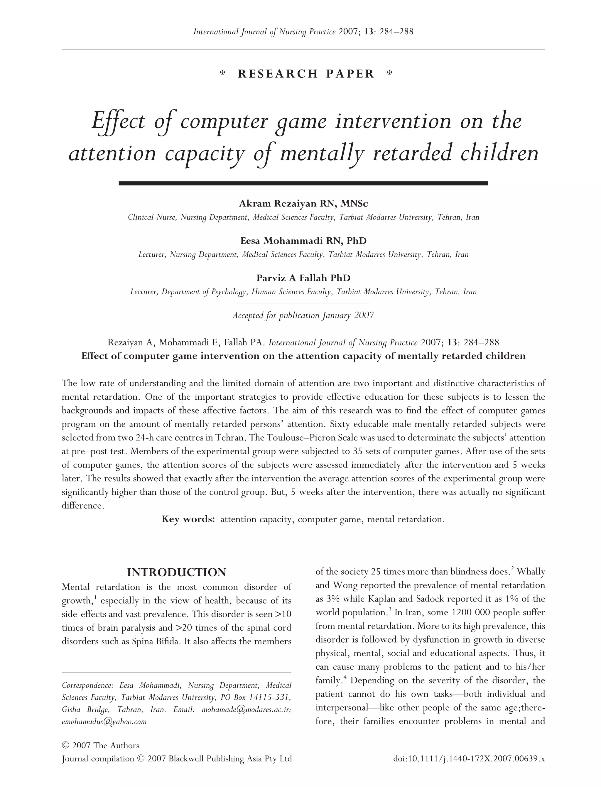 This study examined the effect of a computer game intervention on the attention capacity of 60 mentally retarded male children. The children were randomly assigned to experimental and control groups. The experimental group participated in 35 computer game sessions over time, while the control group received no intervention. Attention was measured before and after the intervention using the Toulouse-Pieron attention scale. Results showed the experimental group had significantly higher attention scores immediately after the intervention compared to the control group. However, 5 weeks later there was no significant difference between the groups, suggesting the attention improvements did not persist over time for these children.