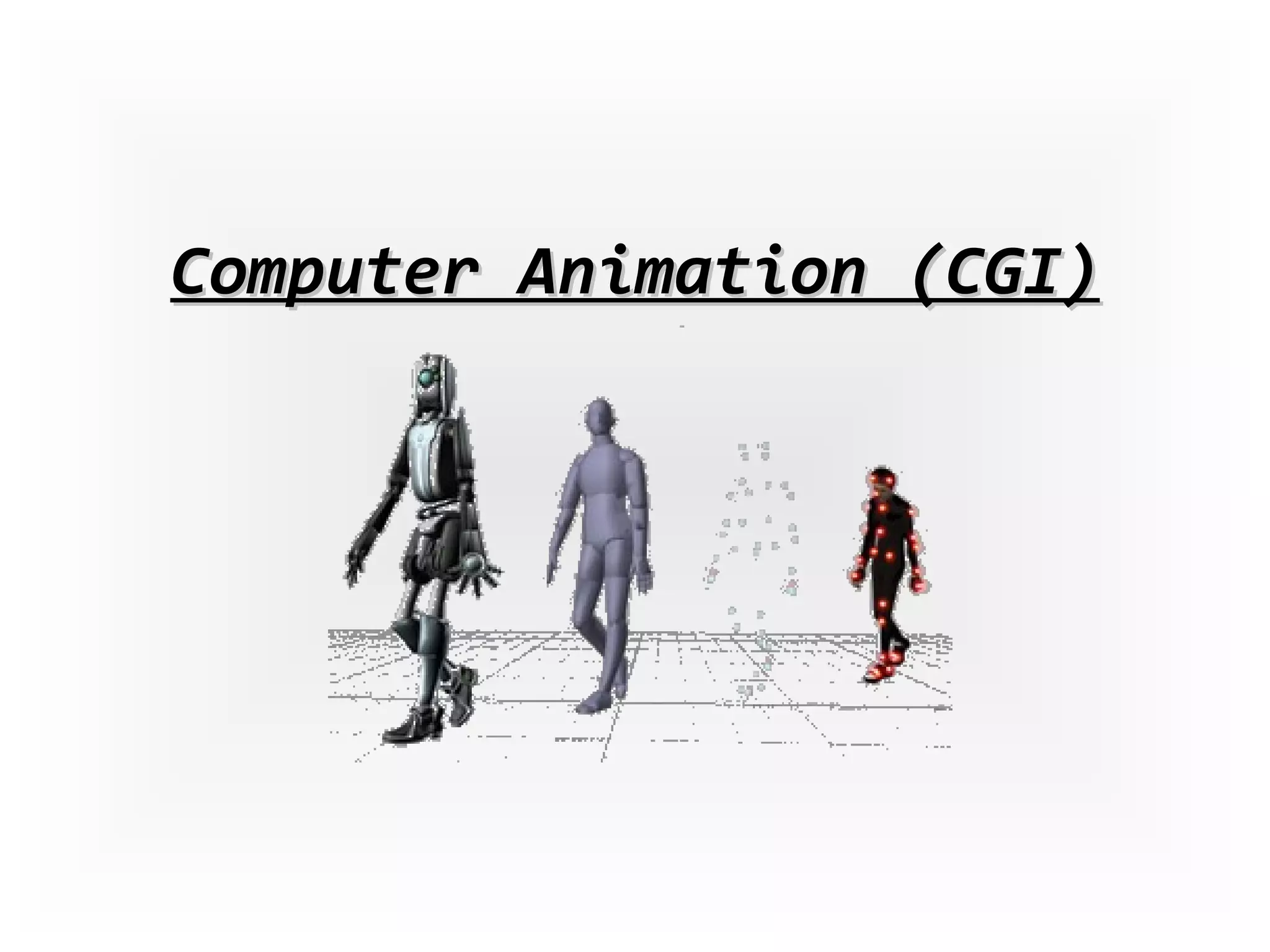 Computer animation is the process of generating animated images using computer graphics. It involves making a series of images that, when displayed rapidly, create the illusion of movement by exploiting the persistence of vision. For movement to appear smooth, images need to be replaced every 1/25th of a second to match the refresh rate of the human retina. Three films from different eras are analyzed to show the progression of CGI technology - the 1980 film Star Wars had basic shapes with little detail, the 2007 Powerpuff Girls film had more detailed shapes and sliding transitions, and the 2010 Shrek film used high quality 3D animation with improved design, humor and audience experience.