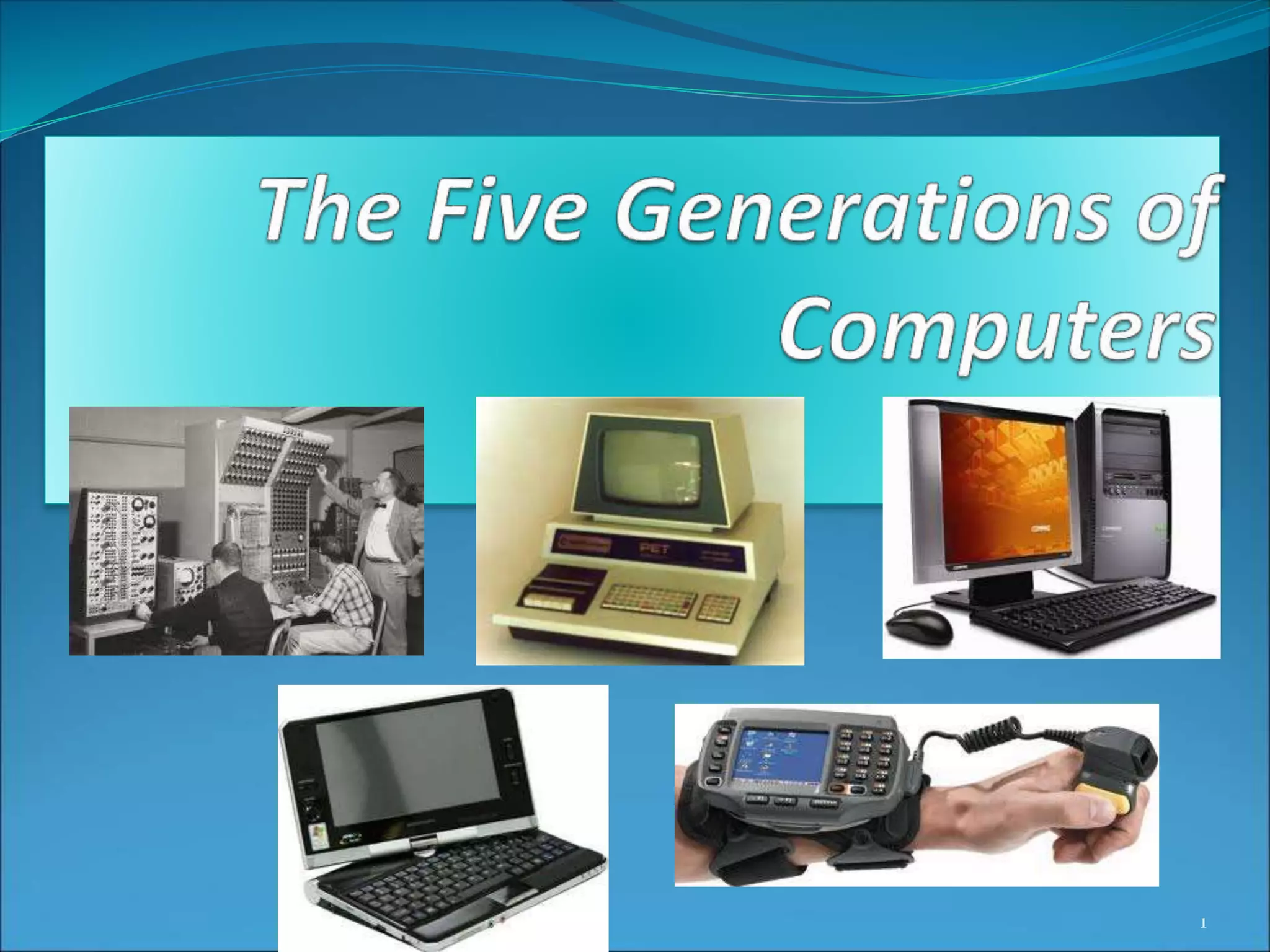 The document discusses the five generations of computers from the 1940s to present. First generation computers used vacuum tubes and magnetic drums, were enormous in size, and relied on machine language. Transistors replaced vacuum tubes in the second generation, which were smaller and more reliable. The third generation saw the development of integrated circuits, which allowed multiple applications to run simultaneously. The fourth generation included microprocessors that placed all components on a single chip. The fifth generation, still in development, focuses on artificial intelligence through parallel processing and superconductors.