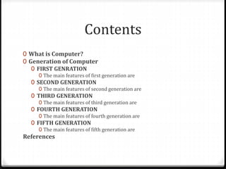 This document discusses the five generations of computers from the first to the fifth generation. The first generation used vacuum tubes and were very large, expensive, and generated a lot of heat. The second generation used transistors which made computers smaller, cheaper, and more reliable. The third generation used integrated circuits which further improved reliability and size. The fourth generation used VLSI circuits and saw the rise of personal computers. The fifth generation, still in development, aims to develop true artificial intelligence using technologies like parallel processing and quantum computing.