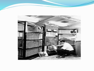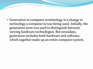 The document summarizes the five generations of computers from 1946 to present. Each generation is characterized by major technological developments that made computers increasingly smaller, cheaper, more powerful and efficient. The first generation used vacuum tubes. The second used transistors. The third used integrated circuits. The fourth used VLSI microprocessors leading to personal computers. The fifth uses ULSI microprocessors and focuses on artificial intelligence and parallel processing.