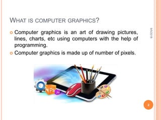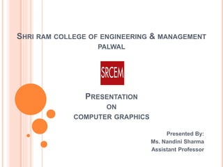 The document is a presentation on computer graphics by Ms. Nandini Sharma, highlighting its definition as the art of creating images using programming. It covers basic terminology such as pixels, resolution, frame buffers, and refresh rates, along with applications in various fields like graphic design, gaming, and virtual reality. The presentation also contrasts raster and random scan displays, explaining their characteristics.