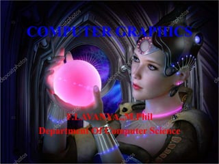 Computer graphics involves using computers to generate digital images. It includes modeling, rendering, and animation. Computer graphics has many applications including CAD, multimedia, image synthesis, GUIs, entertainment, virtual reality, visualization, and desktop publishing. It is widely used in movies, games, medical imaging, and CAD. The image generation process depends on the graphics hardware and display type. Common display technologies include CRTs, LCDs, and plasma displays. Animation can be created through changing properties like shape, size, color, structure, angle, and using techniques such as morphing, wrapping, tweening, panning, and zooming.