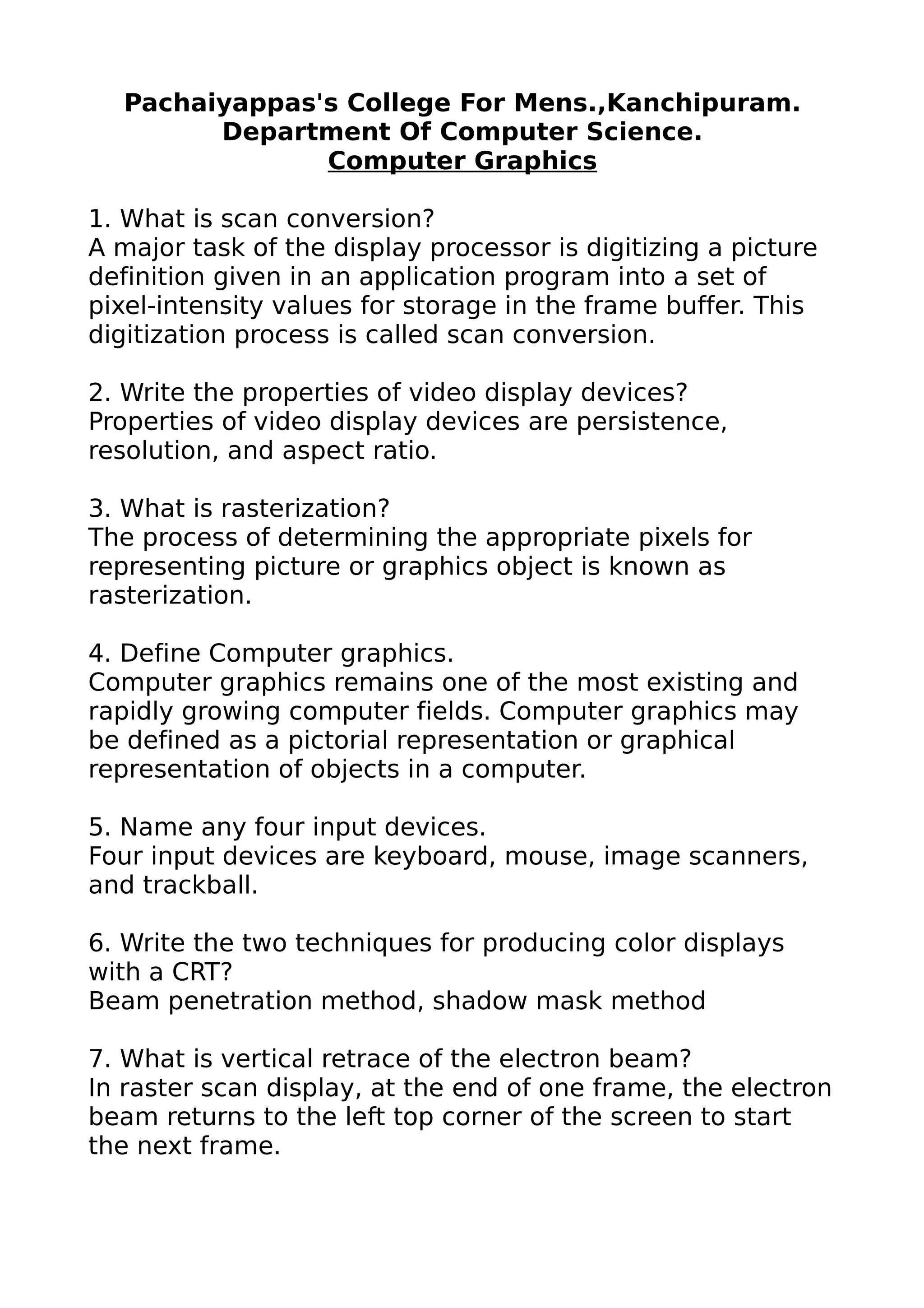 The document discusses various topics related to computer graphics and video display devices. It begins with definitions of key terms like scan conversion and rasterization. It then discusses properties of video display devices like persistence and resolution. Various input and output devices are mentioned along with color display techniques. Concepts related to CRTs like beam retrace and frame buffers are explained. The document also covers graphics transformations, projections, animation, and algorithms like Bresenham's line drawing and Cohen-Sutherland line clipping.