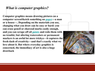 Computer graphics refers to drawing pictures on a computer screen. There are two main types: raster graphics, which uses pixels to build up an image, and vector graphics, which uses mathematical formulas to define shapes. Pioneers in computer graphics developed early systems in the 1950s-60s for scientific and military use. By the 1990s, graphics software like Photoshop and 3D animation in films demonstrated its broad applications today in design, visualization, gaming, and more.