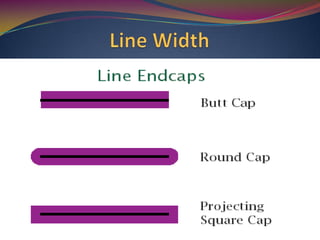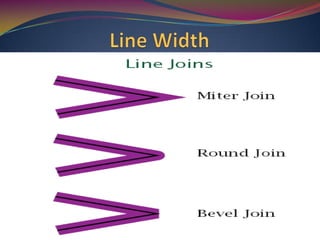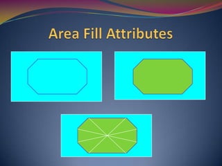 The document discusses different line and area attributes that can be used to display graphics primitives. It describes parameters like line type (solid, dashed, dotted), width, color, and fill style (solid, patterned, hollow). It explains how these attributes can be set using functions like setLineType() and setInteriorStyle(). Pixel masks and adjusting pixel counts are used to properly render dashed lines at different angles. Color can be represented directly or indirectly via color codes mapped to an output device's color capabilities. Patterns for filled areas are defined via 2D color arrays.