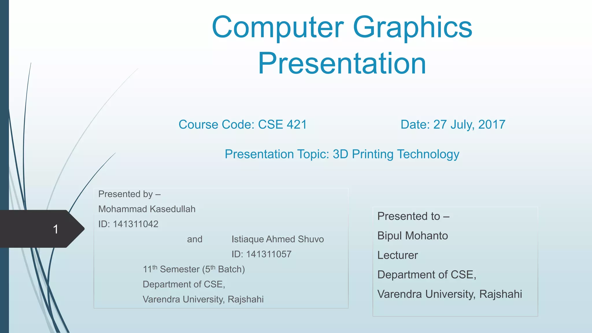 The document is a presentation on 3D printing technology, detailing its introduction, working mechanism, applications, industry growth, and challenges. It highlights how 3D printing, or additive manufacturing, allows the creation of objects layer by layer from digital files and discusses its implications for manufacturing and commerce. Challenges include limitations in material use, design standards, speed, and cost of materials.