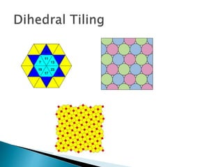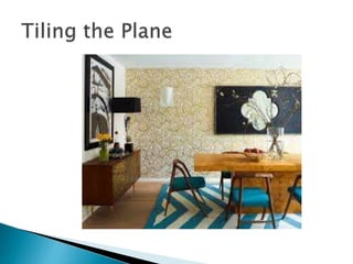 The document discusses various techniques for tiling a plane including monohedral and dihedral tilings using regular polygons. It also discusses recursively defined fractal curves like the Koch curve and Dragon curve which are generated by repeating a simple process to produce self-similar patterns. Grammer based models for simulating plant growth using graftals are also covered.