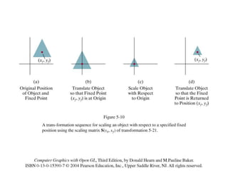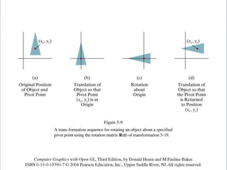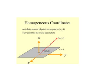 The document discusses 2D geometric transformations including translation, rotation, and scaling. It explains how each transformation can be represented by a matrix and how point coordinates are transformed. It introduces homogeneous coordinates to allow multiple transformations to be combined into a single matrix multiplication by expanding points into 3D vectors. This allows complex sequences of transformations to be applied efficiently in one step.