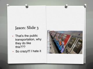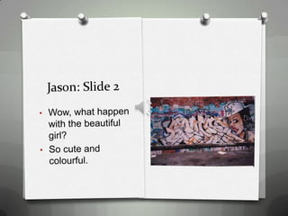 This document contains comments from multiple students sharing their opinions on examples of graffiti in Melbourne. Some students thought graffiti added artistic expression and color to the city, while others felt it made areas look ugly. One student highlighted a piece depicting a mother rabbit and her babies as something they liked. Another commented on a graffiti image of a lobster with a scary face that might frighten children or make them laugh. Overall opinions on graffiti ranged from appreciating public art to disliking vandalism that degraded the appearance of neighborhoods.