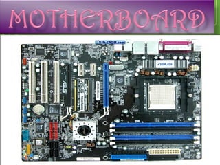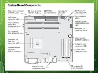 The document lists and describes the main hardware components of a computer system. It includes the central processing unit (CPU), motherboard, memory (RAM), storage devices (hard disk drive, floppy disk drive, CD-ROM drive, DVD drive), ports, and input/output devices (keyboard, mouse, monitor). The motherboard contains slots and connectors for attaching these components. Memory is used for temporary storage of running programs and data, while storage devices provide permanent storage even when the computer is turned off.