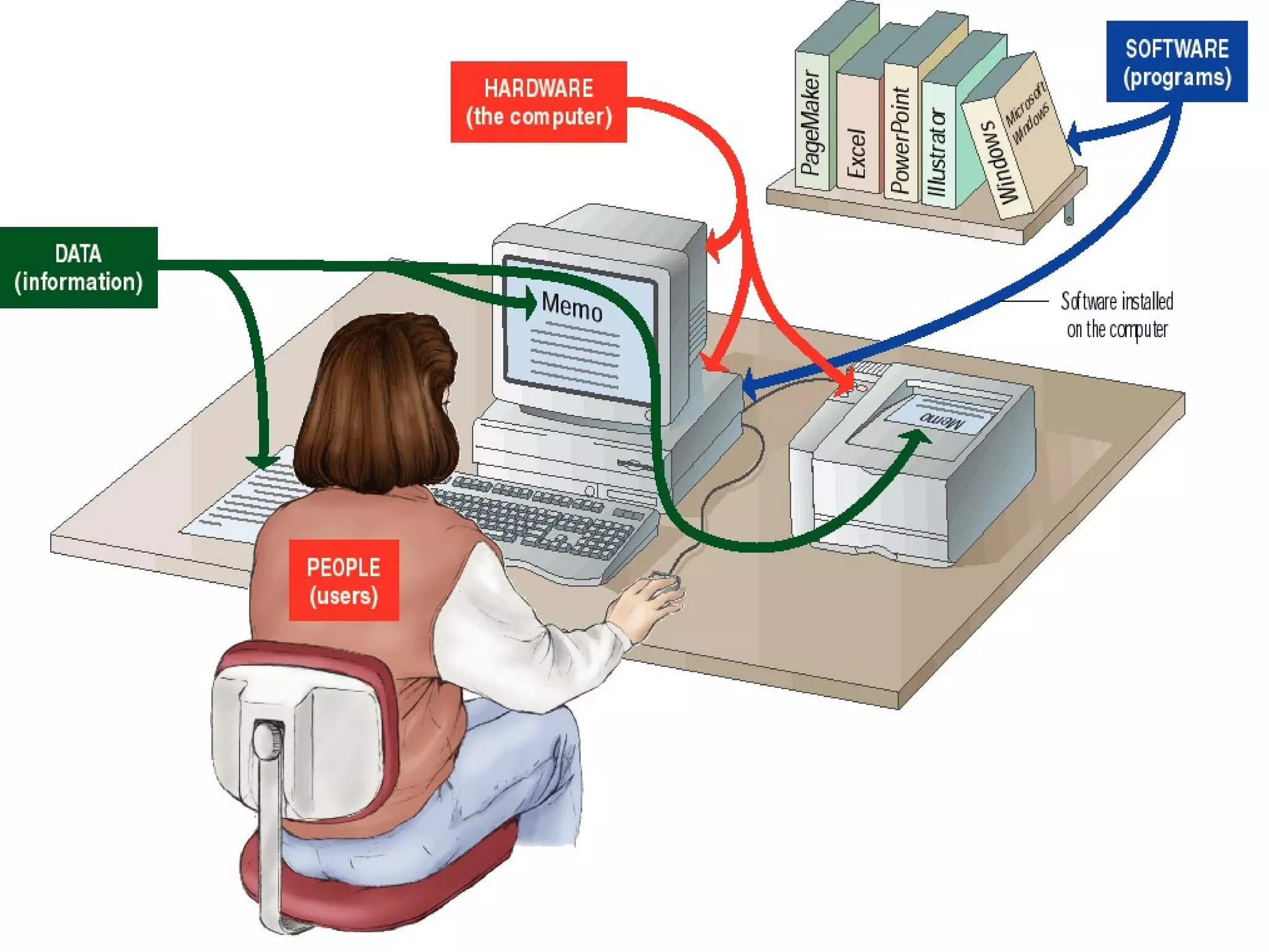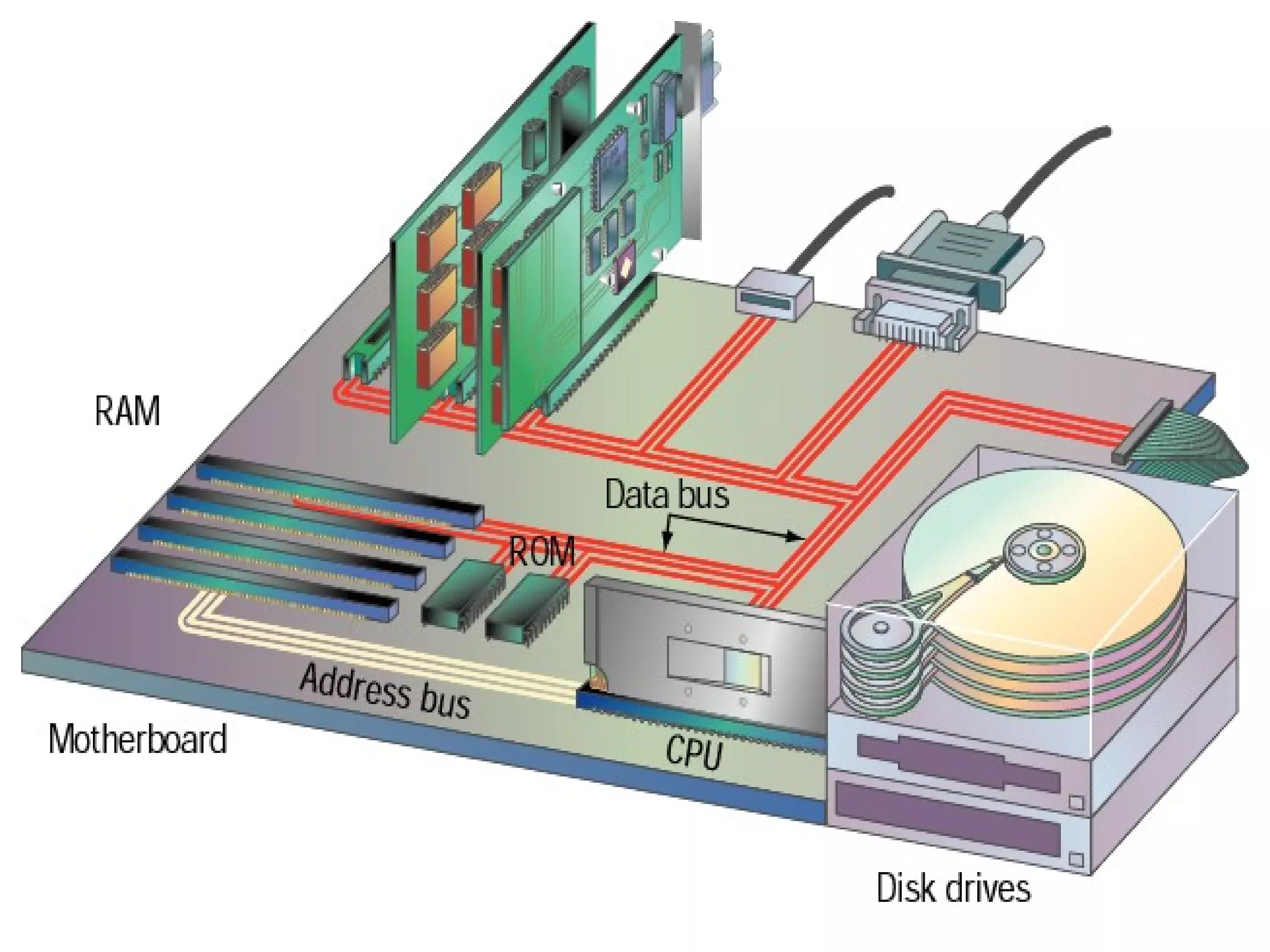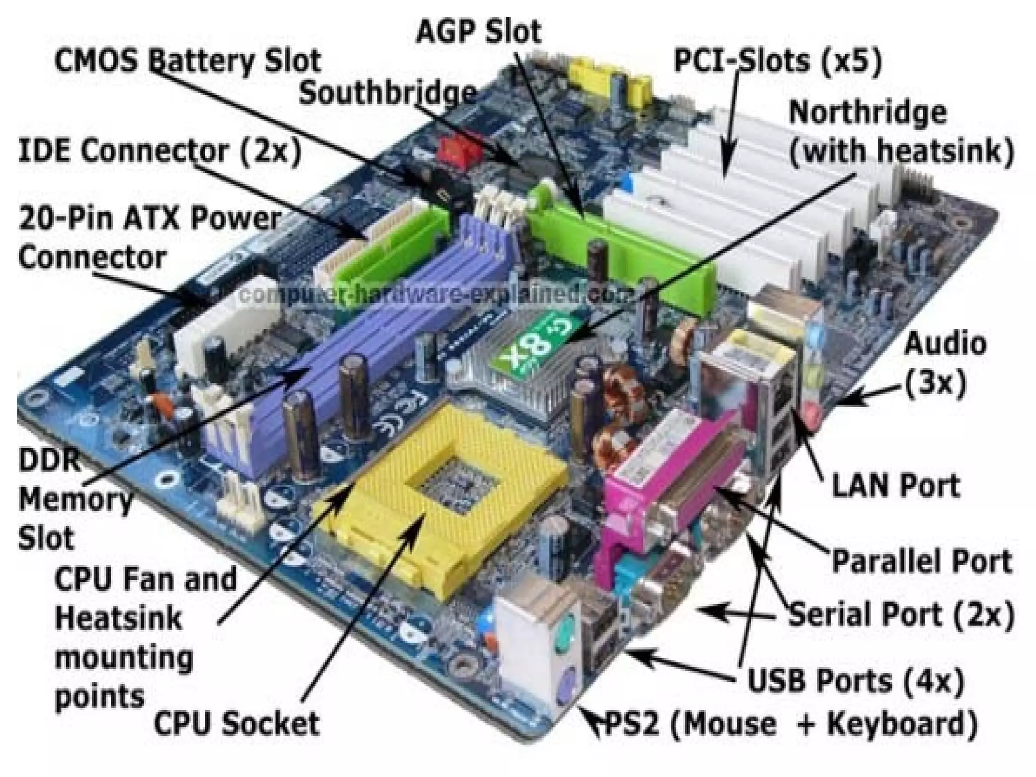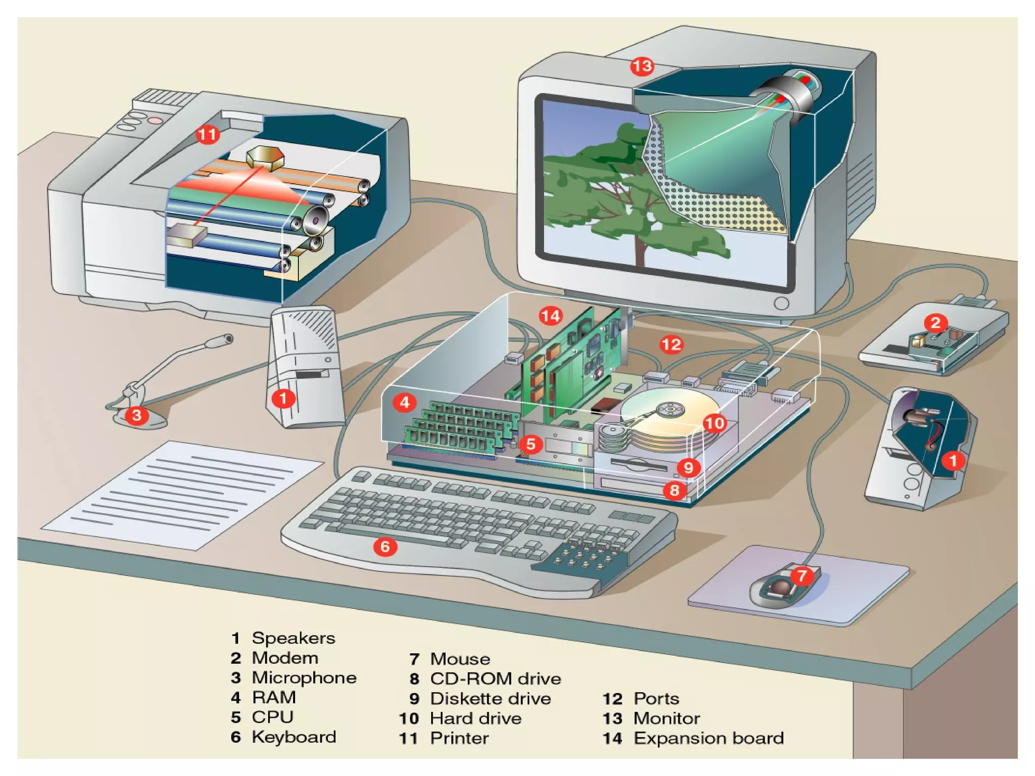 The document provides an overview of basic computer hardware components. It discusses the central processing unit (CPU), memory units, input/output devices, storage devices like hard disk drives, optical drives, and peripherals. It also covers the motherboard, bus architecture, and factors that affect processing speed such as registers, RAM, the system clock, cache memory, and the bus. Printers, monitors, video cards, modems, network interface cards, air conditioners, uninterruptible power supplies, and RAID devices are also briefly described.