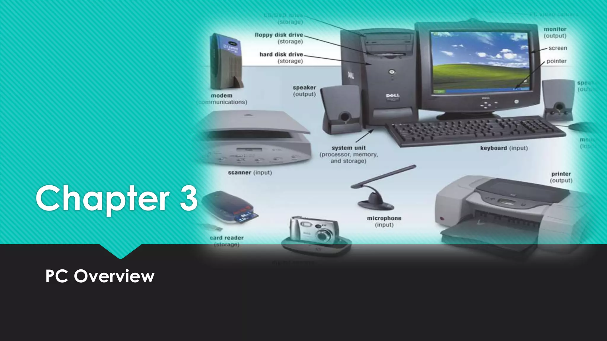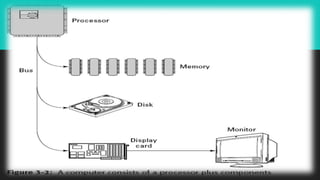 The document provides an overview of the key components inside a personal computer. It discusses the system unit which houses the main components including the motherboard, processor, memory, video card, sound card, ports, drive bays, and power supply. The processor executes instructions to perform tasks while the memory temporarily stores data and instructions. Other components like the hard disk, video card, and monitor allow for permanent storage, graphics processing, and visual output.