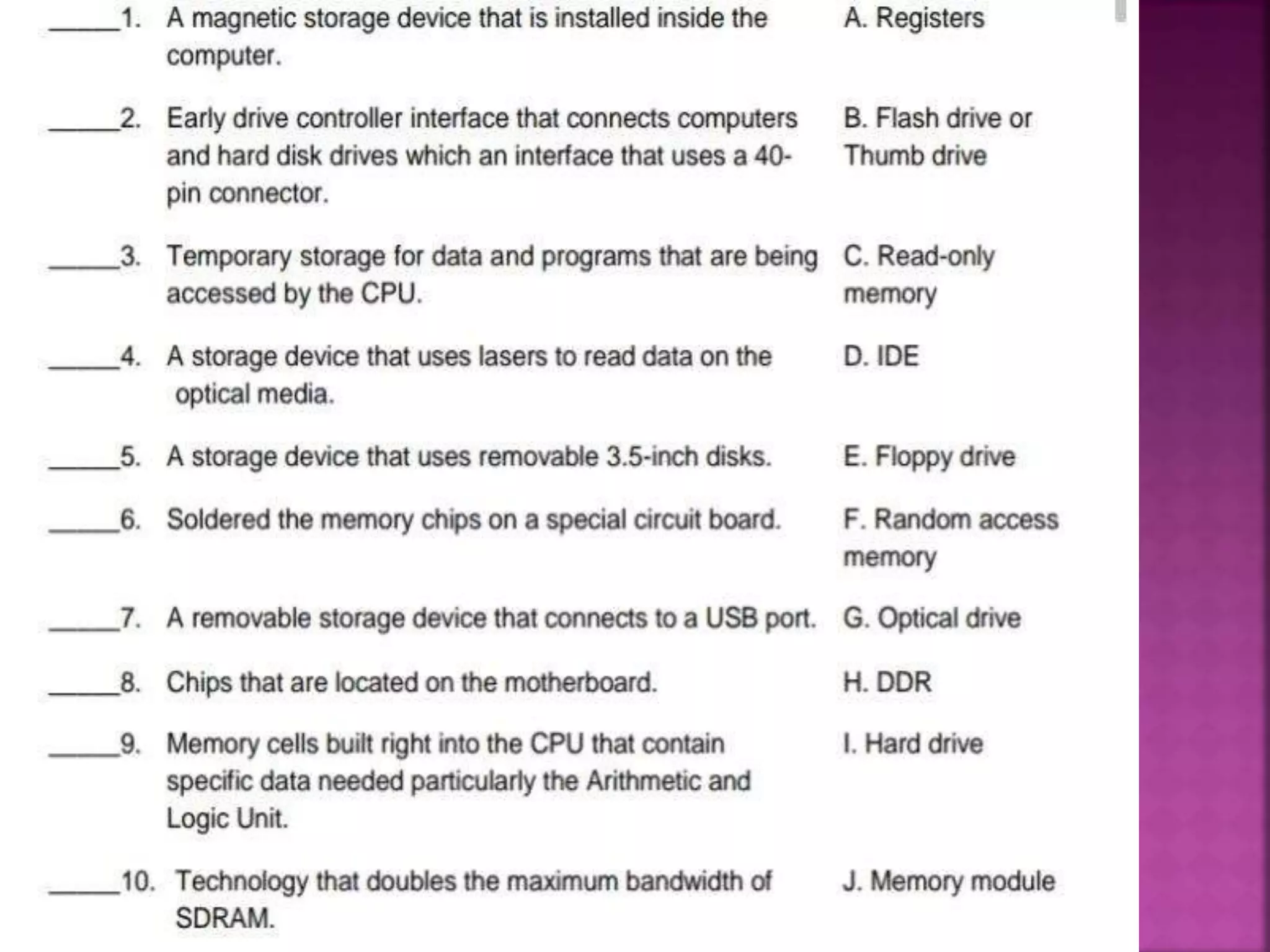 This document provides information about computer hardware servicing and digital presentation. It defines common computer terms like bit, byte, booting, electronic storage, interfaces, laser, magnetic storage, memory modules, operating systems, and optical storage media. It also describes different types of computer hardware like hard disk drives, floppy drives, optical drives, external flash drives, and drive interfaces. The document includes exercises to match terms with definitions and convert decimal numbers to binary.