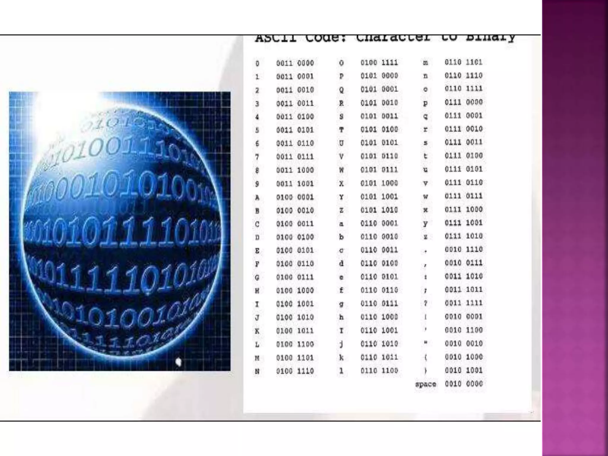 binary codes to represent and interpret letters, numbers and peciall