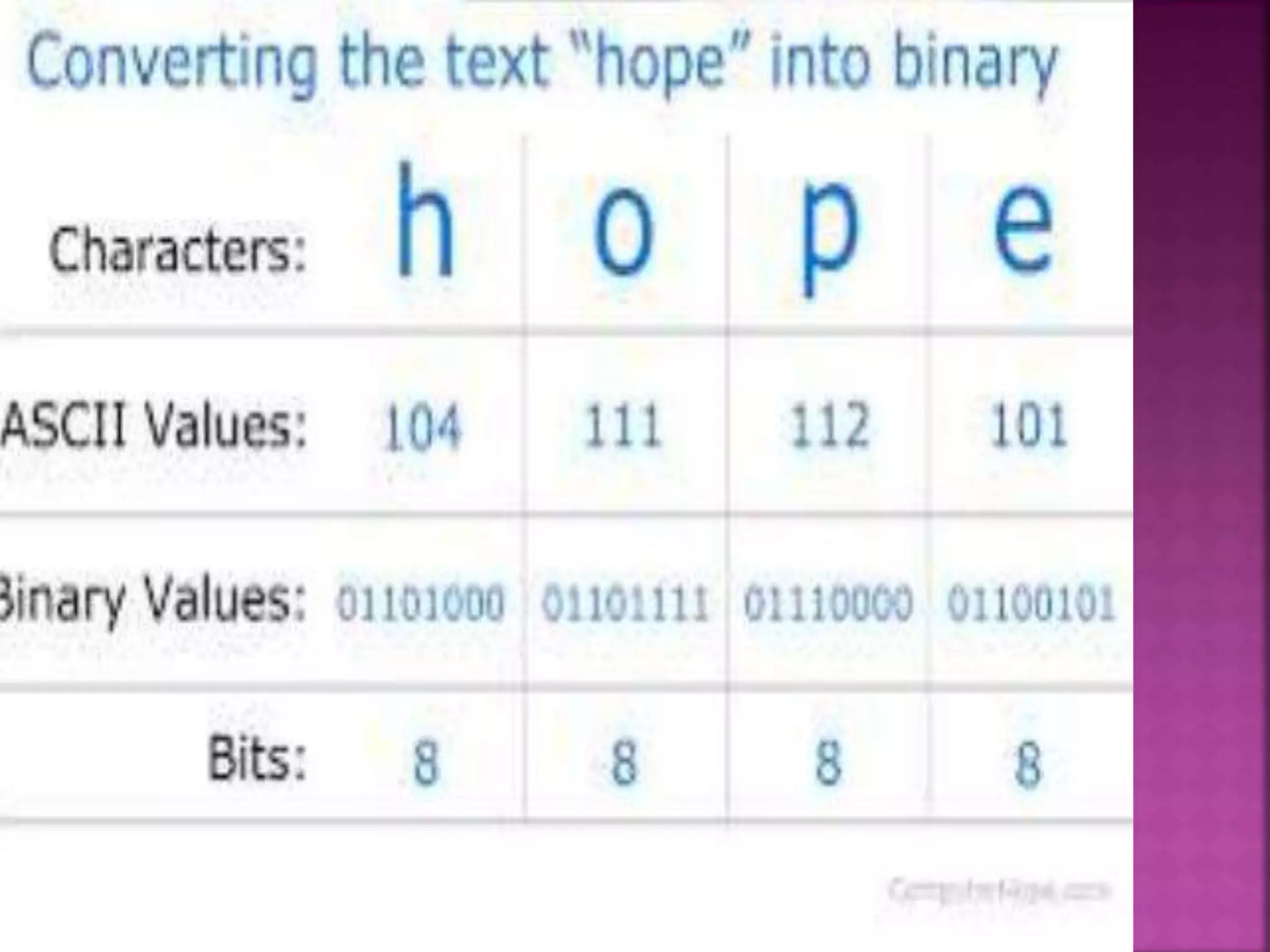 Capital letter: A = 01000001