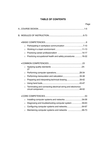 This document outlines a competency-based curriculum for a Computer Hardware Servicing NC II qualification in the Information and Communication Technology sector. The course is designed to develop the knowledge, skills, and attitudes of a computer service technician according to industry standards. The course covers 392 hours of instruction organized into modules addressing basic, common, and core competencies related to installing, maintaining, configuring, and diagnosing computer systems and networks. Assessment methods include hands-on demonstration, direct observation, oral/written exams, and practical testing.