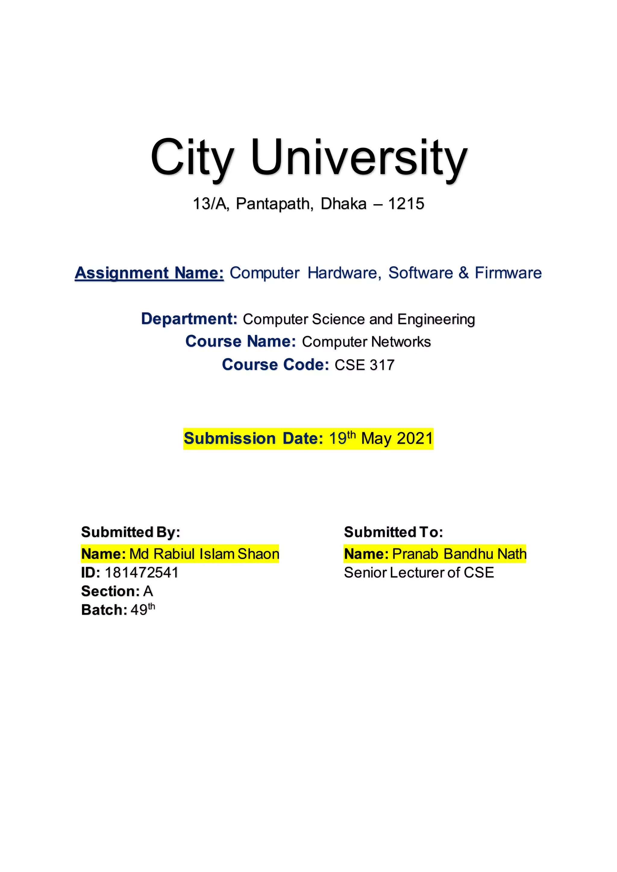 The document outlines the differences between hardware, software, and firmware, explaining their definitions, functions, and characteristics. It further distinguishes between system software and application software, detailing their requirements, user interaction, and examples. Additionally, the document mentions the importance of drivers in connecting hardware to operating systems.