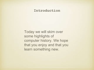 This document provides a brief overview of some key events and innovations in computer history from 1937 to 2015. It describes the creation of some of the earliest computers like the Model K adder and Z2, the founding of Hewlett-Packard, and the completion of the Complex Number Calculator which enabled remote access computing. Later developments discussed include the Ferranti Mark I as the first commercially available general-purpose computer, the introduction of early transistor computers like the NEAC 2203, and the release of early home computers like the VIC-20 and personal devices like the Apple Watch.