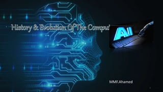 The document outlines the historical evolution of computing devices, beginning with ancient tools like the abacus and progressing through various advancements such as Napier's device, the slide rule, mechanical calculators, and the development of electronic computers like ENIAC and EDVAC. It categorizes computer generations from vacuum tubes to artificial intelligence, detailing significant innovations such as transistors, integrated circuits, and microprocessors. Key milestones include the development of personal computers and the potential future impact of artificial intelligence technologies.