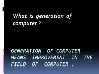 The document discusses the five generations of computers from the 1940s to present. The first generation used vacuum tubes and magnetic drums. The second generation introduced transistors, making computers faster, cheaper and smaller. The third generation saw the development of integrated circuits and silicon chips. The fourth generation featured microprocessors, allowing computers to be incorporated into many products. The fifth generation focuses on artificial intelligence through parallel processing and superconductors.