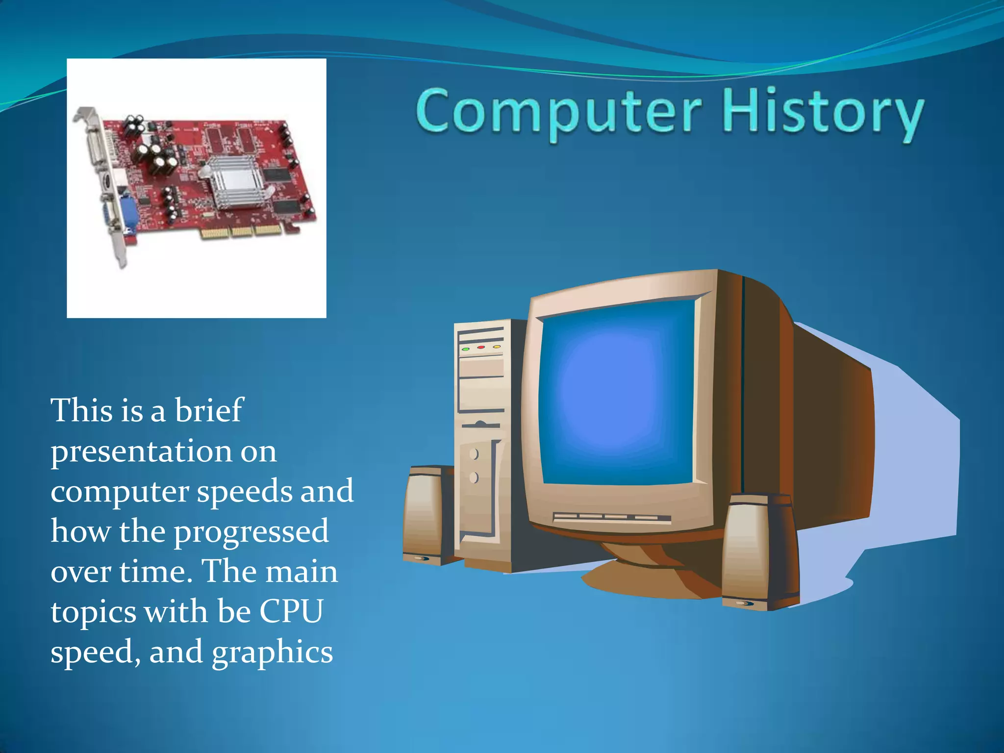 Computer speeds and graphics have progressed significantly over time. CPU speeds from Intel and AMD have increased through competition, starting in the 1990s at MHz levels and increasing each year. Early computer graphics used light pens to draw, while today we have powerful CAD programs and 3D modeling like the iconic Utah Teapot, which has been a symbol of 3D editing since 1975.