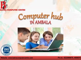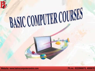 The document provides information about hardware and software components of a computer, including details on input and output devices, storage solutions, and their purposes. It describes the functionality of various devices used for data entry, processing, and storage, as well as the role of different types of software. Additionally, the document includes contact information for Batra Computer Centre and lists courses they offer, such as programming and web development.